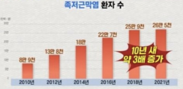 이러한 족저근막염 환자수는 2010년 8만 9천명에서 2021년에는 26만 5천 명으로 환자수가 10년 사이 3배가 급증할 정도로 많은 현대인들이 고생하는 질병입니다.
