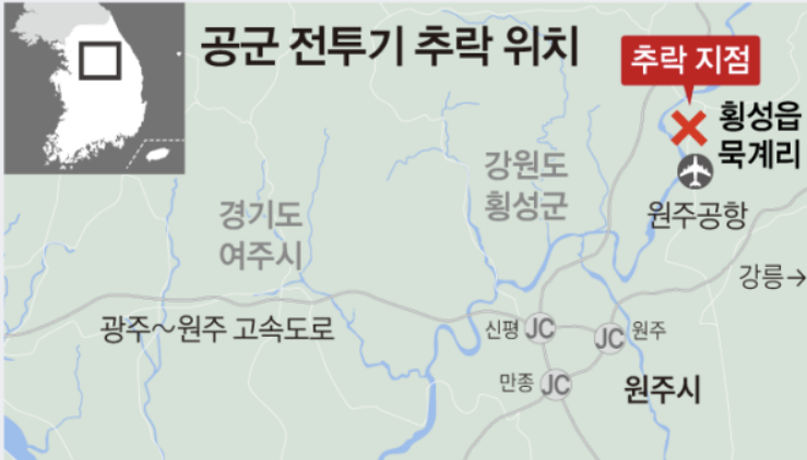 "26일 오전 11시 40분경 강원도 횡성군 횡성읍 묵리에서 공군 KA-1 공격기로 추정되는 전투기가 추락했으며 사고 기체 타고 있던 조종사 2명은 자력으로 탈출한 것으로 알려졌습니다."