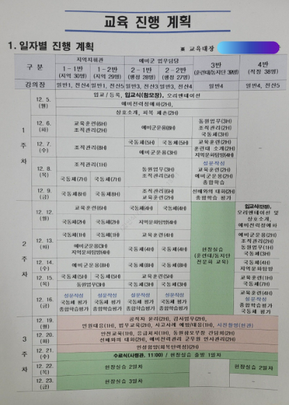 세부 교육진행이 3주에 걸쳐서 진행이 되는데 대부분의 교육이 임용이후 임무수행과 밀접한 과목이다보니 교육에 열성을 다하여 들으시리라 생각됩니다. 생각보다 예비군 임무를 수행하면서 소수의 직렬이다보니 궁금한점이 생기면 인접부대의 먼저 임용되신 선배들을 통해서 물어보는 수밖에 없는데 이마저도 여의치 않은 경우가 많다보니 교육 간 수업을 최대한 열심히 들으시고 선배와의 대화 시간때 꼭 연락처를 물어보셔서 전화번호를 저장하시기 바랍니다. 여기서 알게된 지식정보 하나하나가 나중에 임무수행할때 최대한 자신감있게 시행착오를 줄일수 있도록 도와줄것입니다.