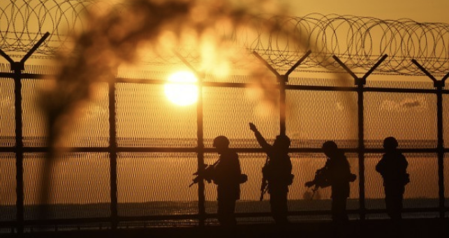 강원도 삼척시 고포해안 일대에서 철책을 따라 정밀정찰 중인 육군 23경비여단 불사조대대 장병들 뒤로 붉은 태양이 솟아오르고 있습니다.