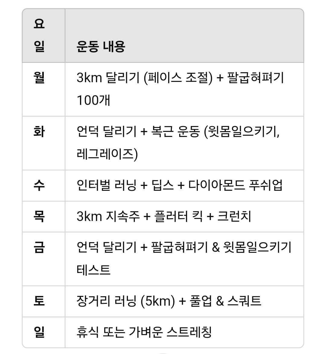 ✅ 훈련 루틴 (주 4~5일, 점진적 증가)