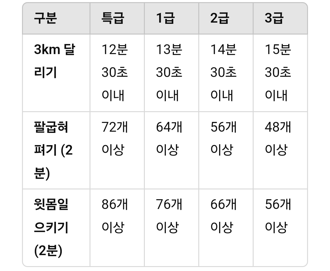 먼저, 2024년 기준 군 체력검정 특급 점수를 살펴보자. 특급을 받기 위해서는 3km 달리기, 팔굽혀펴기, 윗몸일으키기 세 가지 종목에서 일정 기준을 통과해야 한다.