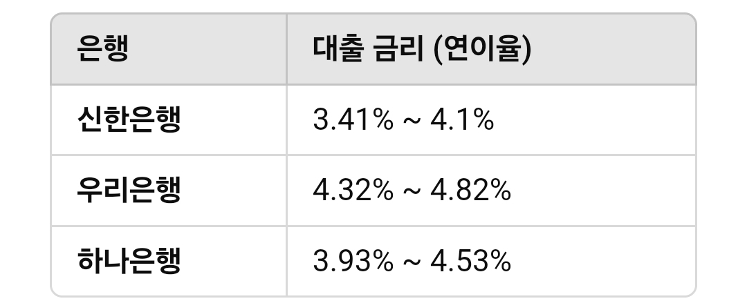 - 신한은행, 우리은행, 하나은행 중 금리 비교 후 선택