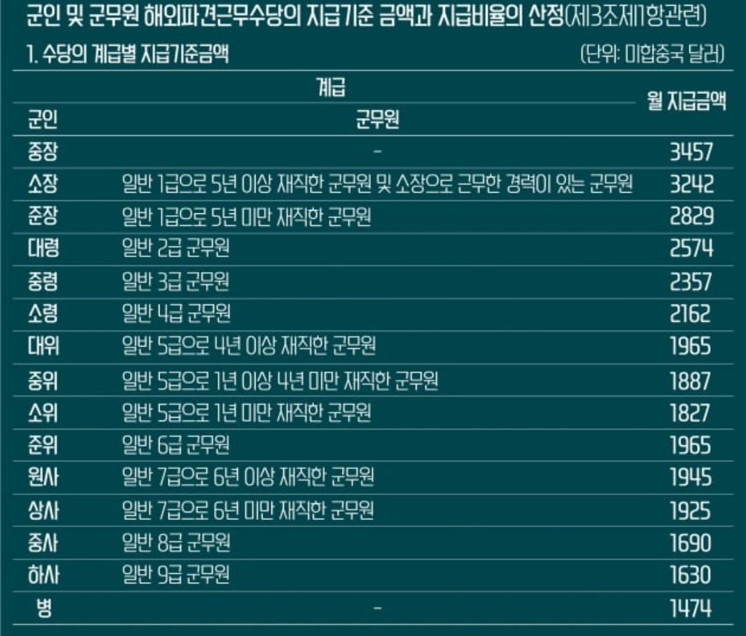 아크부대의 파병 수당은 계급과 임무에 따라 차이가 있지만, 대략적인 수준은 다음과 같습니다.