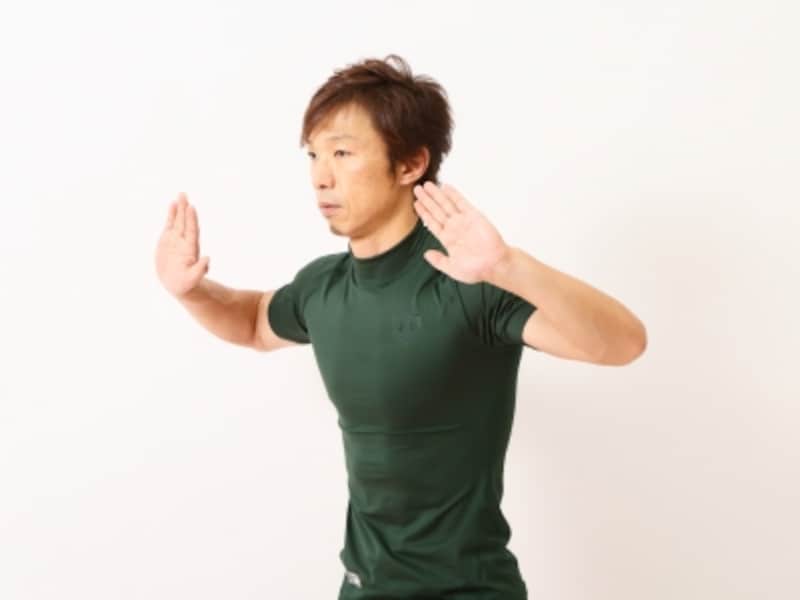 양손을 어깨 바로 아래에 펴고 손의 손가락을 일자로 쭉 뻗습니다.