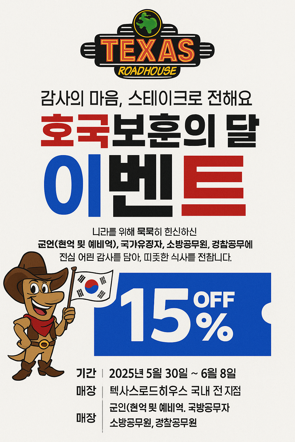 행사는 2025년 5월 30일부터 6월 8일까지, 텍사스 로드하우스 국내 전 매장에서 진행됩니다.