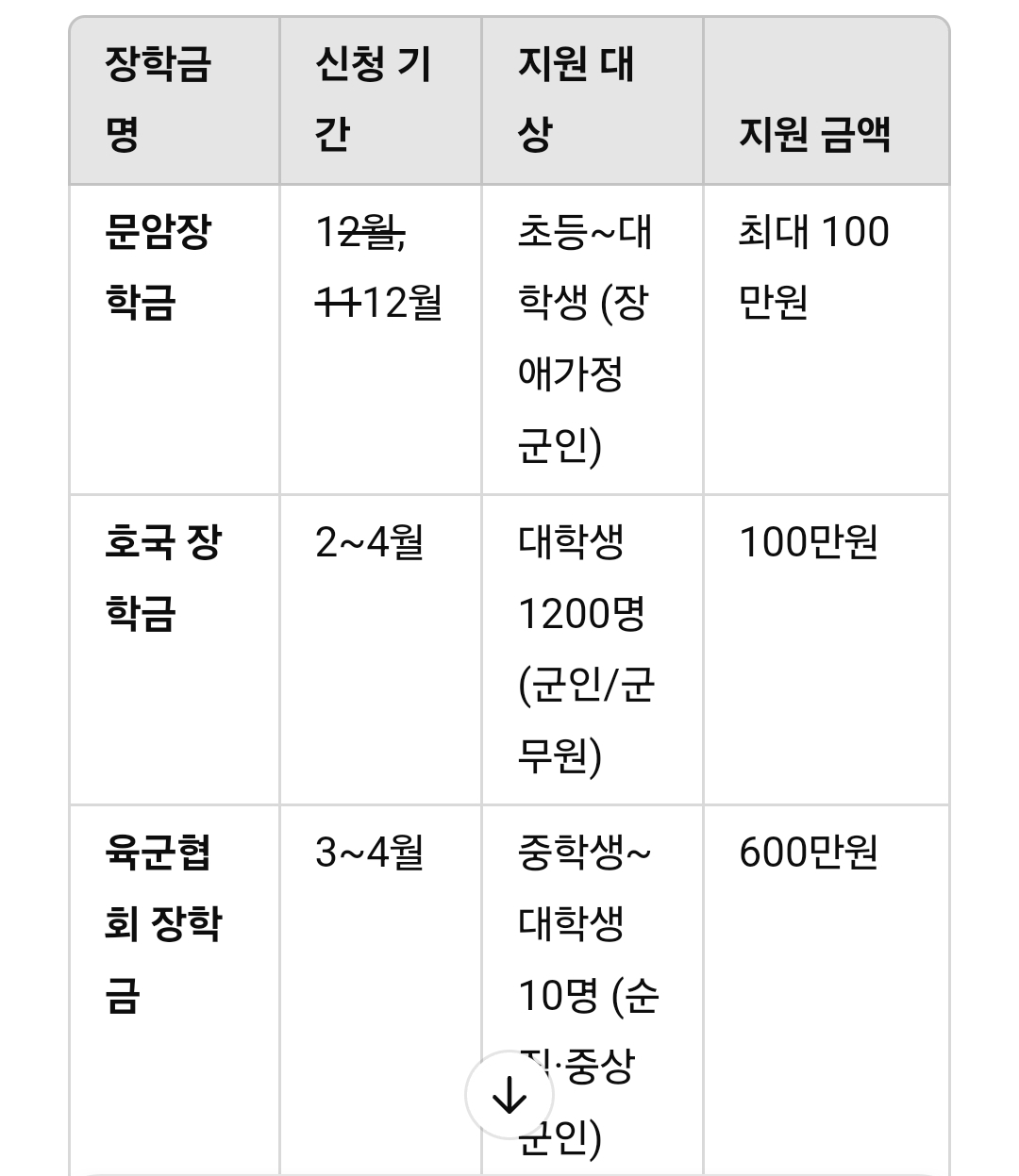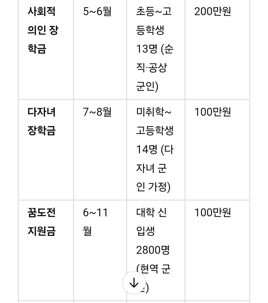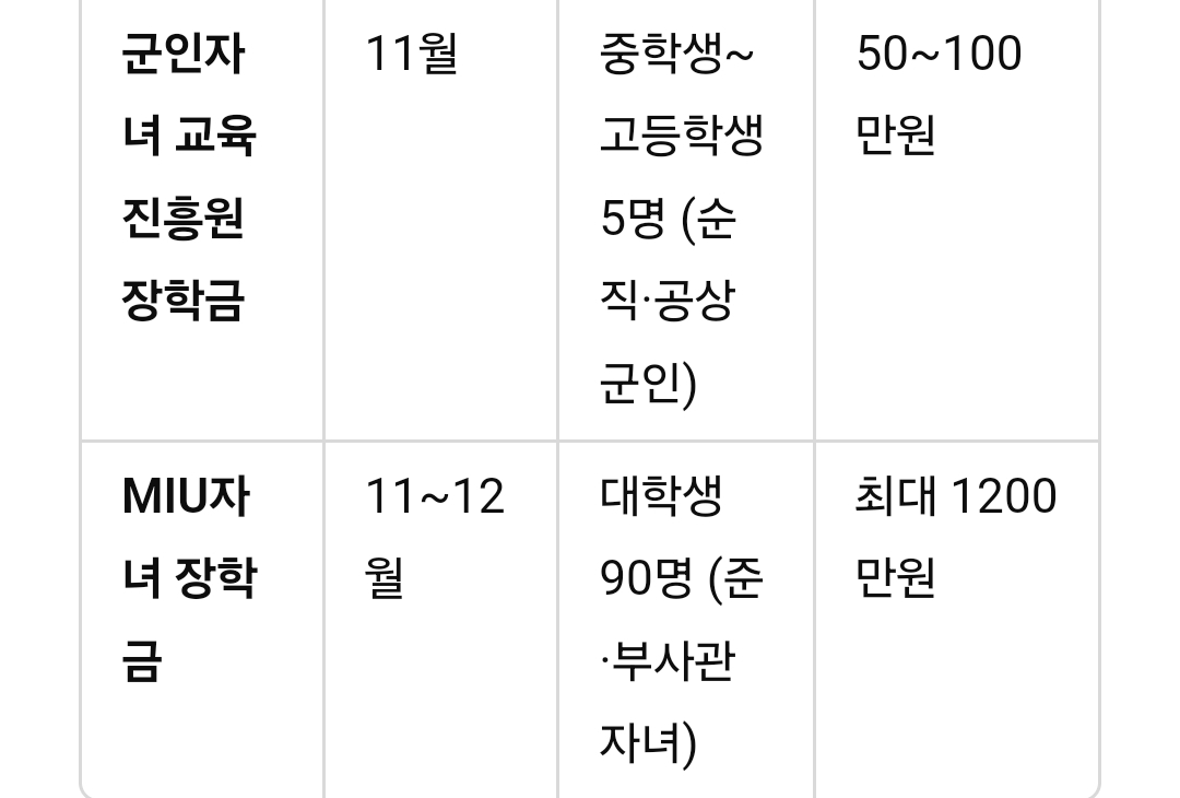 아래는 2025년 주요 군 자녀 장학금의 신청 기간, 지원 대상, 금액을 정리한 표입니다.