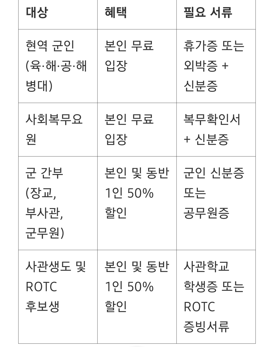 (1) 휴가 중인 군인 및 사회복무요원 (무료 입장)
