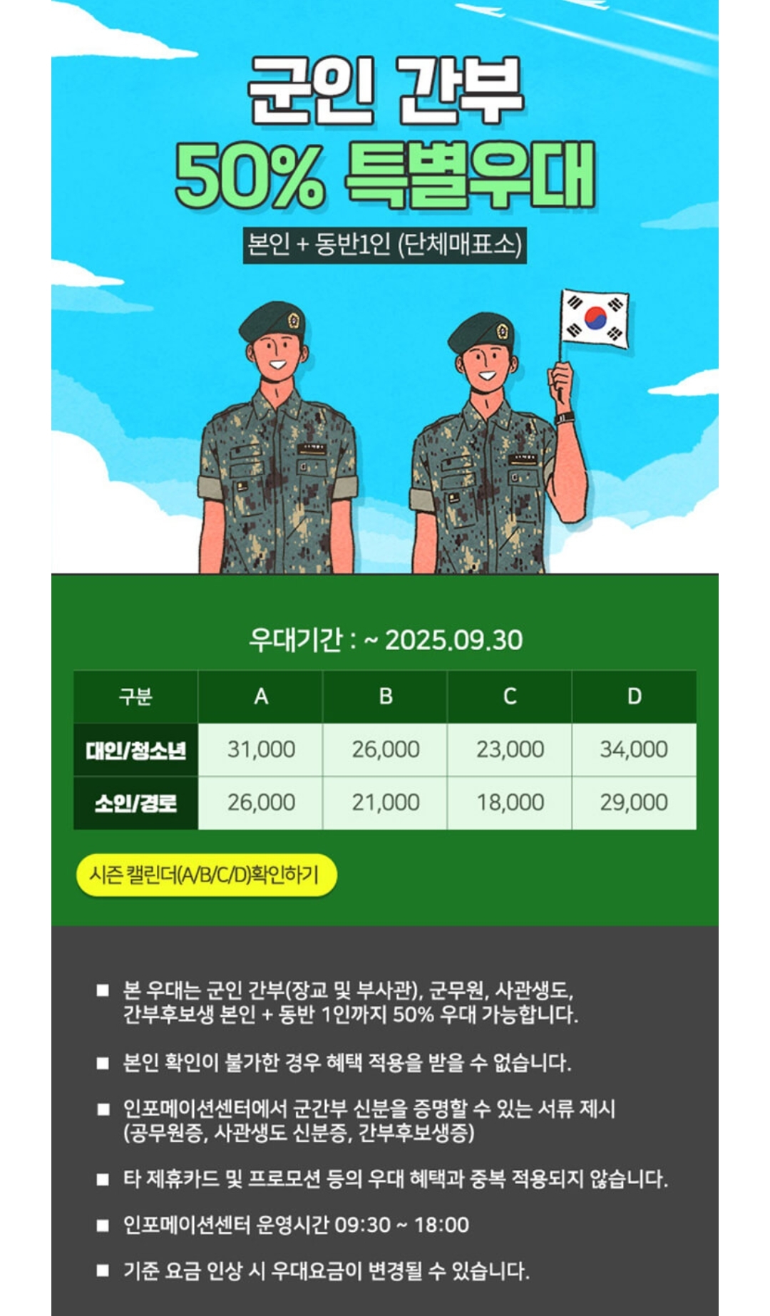 직업군인과 사관생도는 본인뿐만 아니라 동반 1인까지 50% 할인 혜택을 받을 수 있습니다.