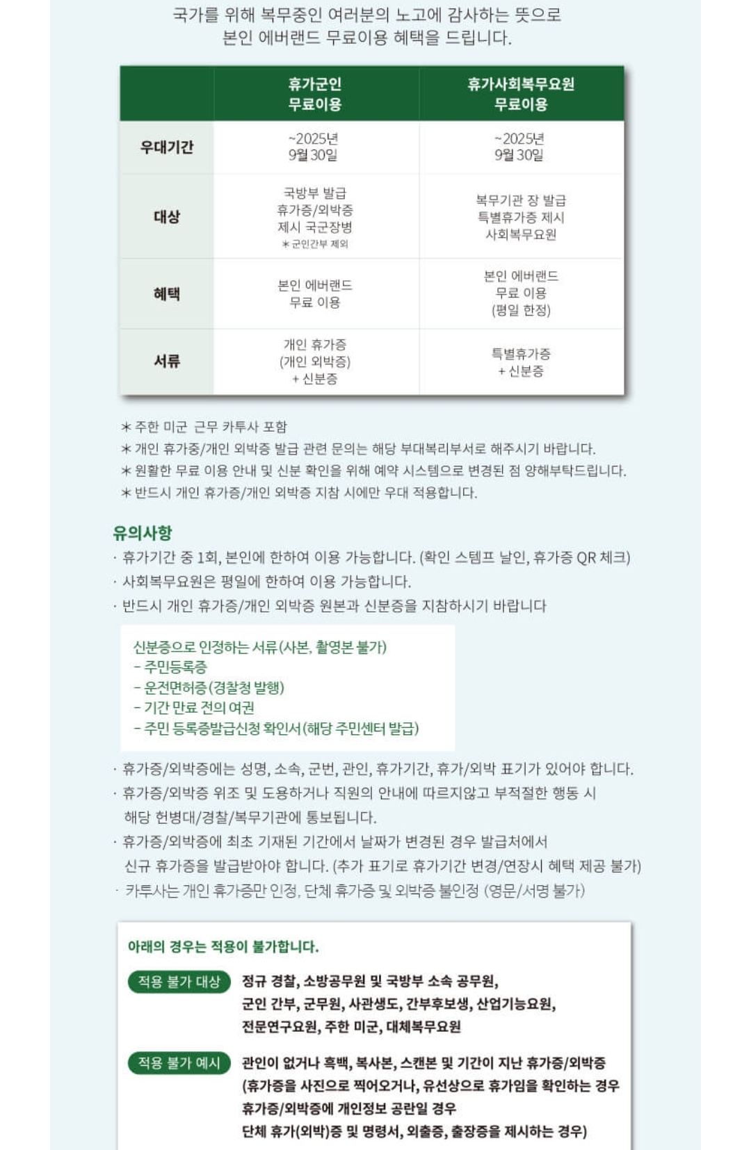 다만, 이를 이용하기 위해서는 군 신분증과 함께 휴가증 또는 외박증을 반드시 지참해야 합니다. 증빙서류가 없을 경우 할인 적용이 불가능하니 유의하시기 바랍니다.