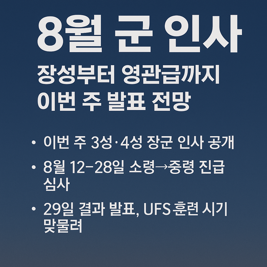 이번 주에는 중장 및 대장 장군 진급과 보직 인사가 예정돼 있으며, 이어서 소령→중령 진급 심사가 8월 12일부터 28일까지 진행됩니다.