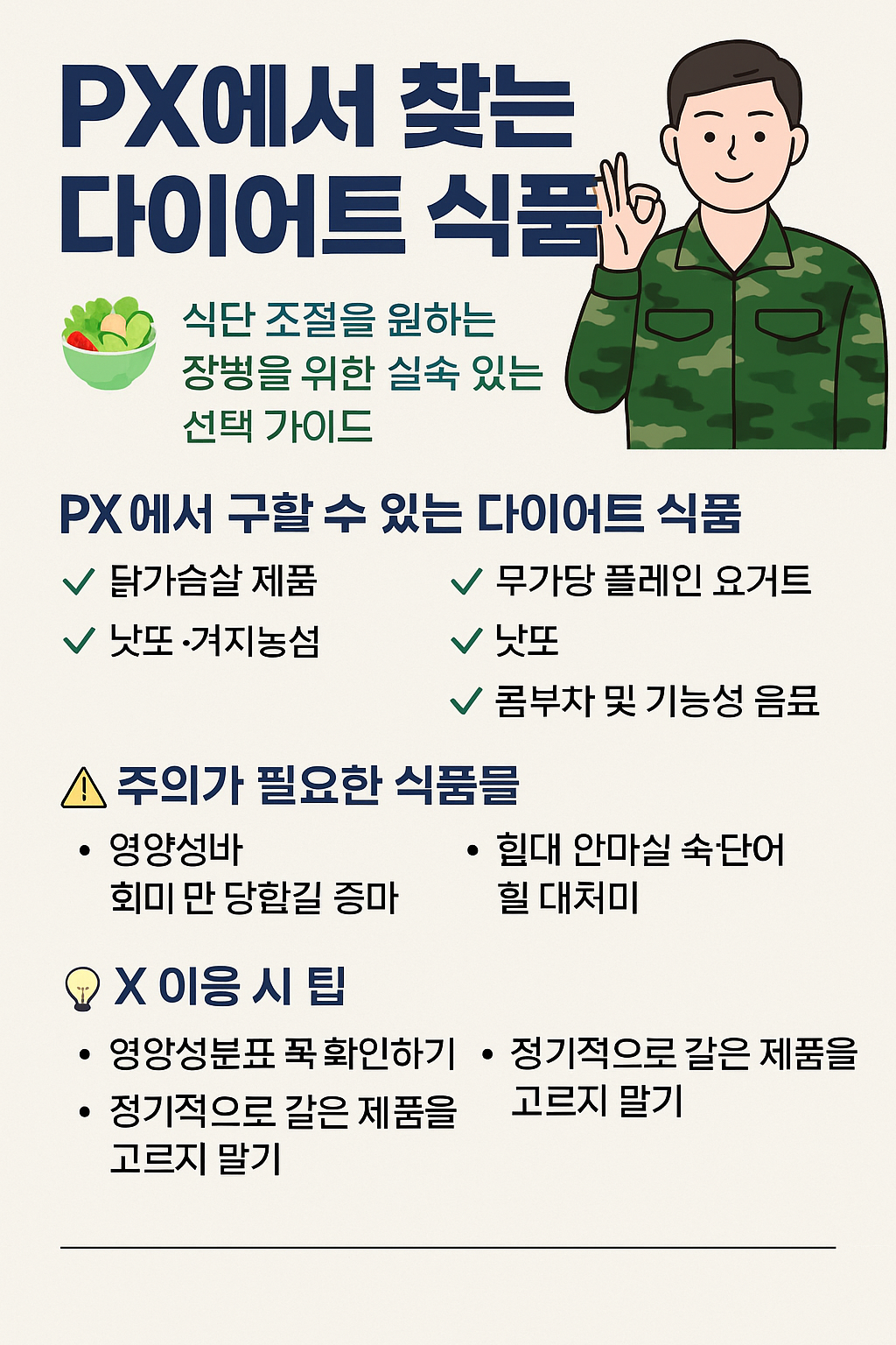 부대 환경에서는 선택지가 제한적일 수 있지만, PX를 지혜롭게 활용한다면 다이어트도 충분히 가능합니다.